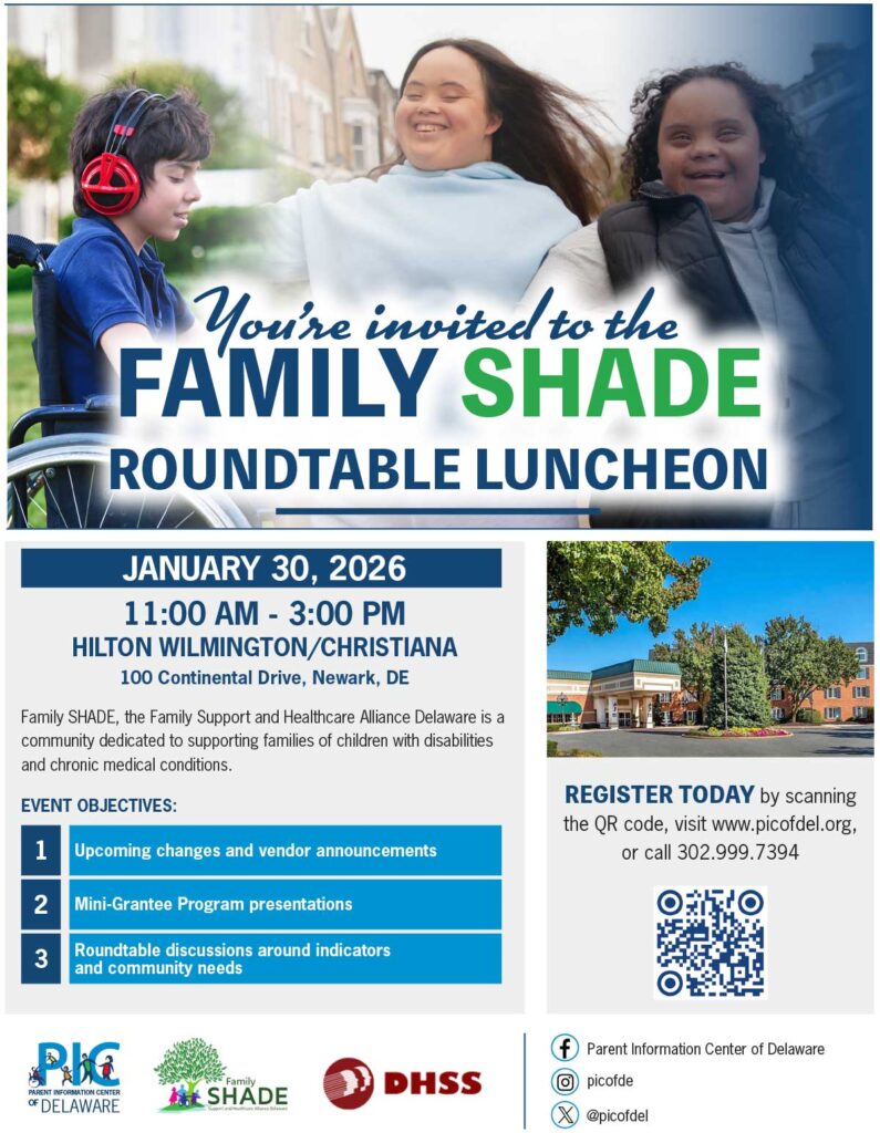 Family SHADE, the Family Support and Healthcare Alliance Delaware: A community dedicated to supporting families of children with disabilities and chronic medical conditions.